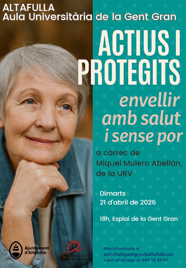 L'Ajuntament d'Altafulla i l'Aula Universitària de la Gent Gran us conviden a una nova sessió formativa centrada en el benestar i la seguretat en la maduresa. Sota el títol "Actius i protegits: envellir amb salut i sense por", explorarem les claus per mantenir una vida plena i segura.