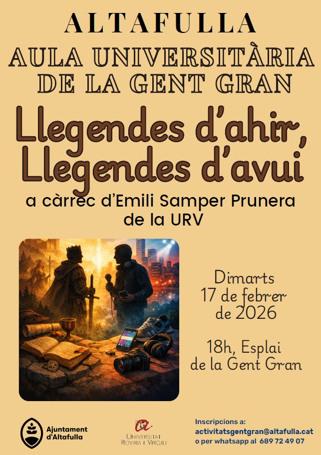 L'Aula Universitària de la Gent Gran d'Altafulla presenta una nova sessió sota el títol "Llegendes d'ahir, Llegendes d'avui". En aquesta xerrada, explorarem com les històries i els mites han evolucionat des del passat fins a convertir-se en les narratives que coneixem en l'actualitat.