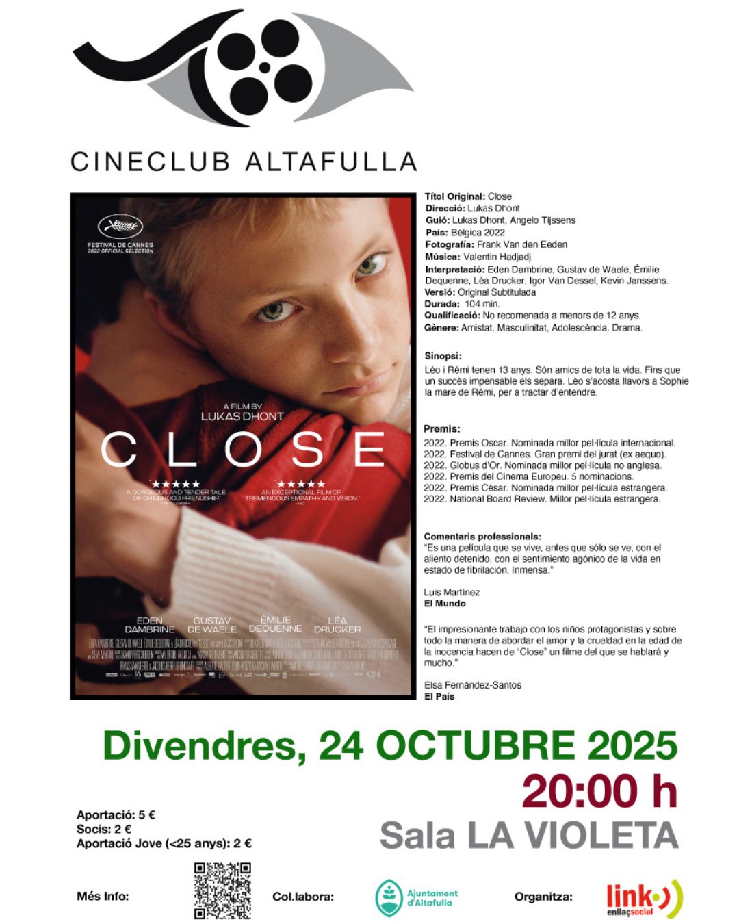 El Cineclub Altafulla torna amb una de les pel·lícules més aclamades dels últims anys. Us convidem a la projecció de "Close", el drama guanyador del Gran Premi del Jurat a Canes, dirigit per Lukas Dhont.