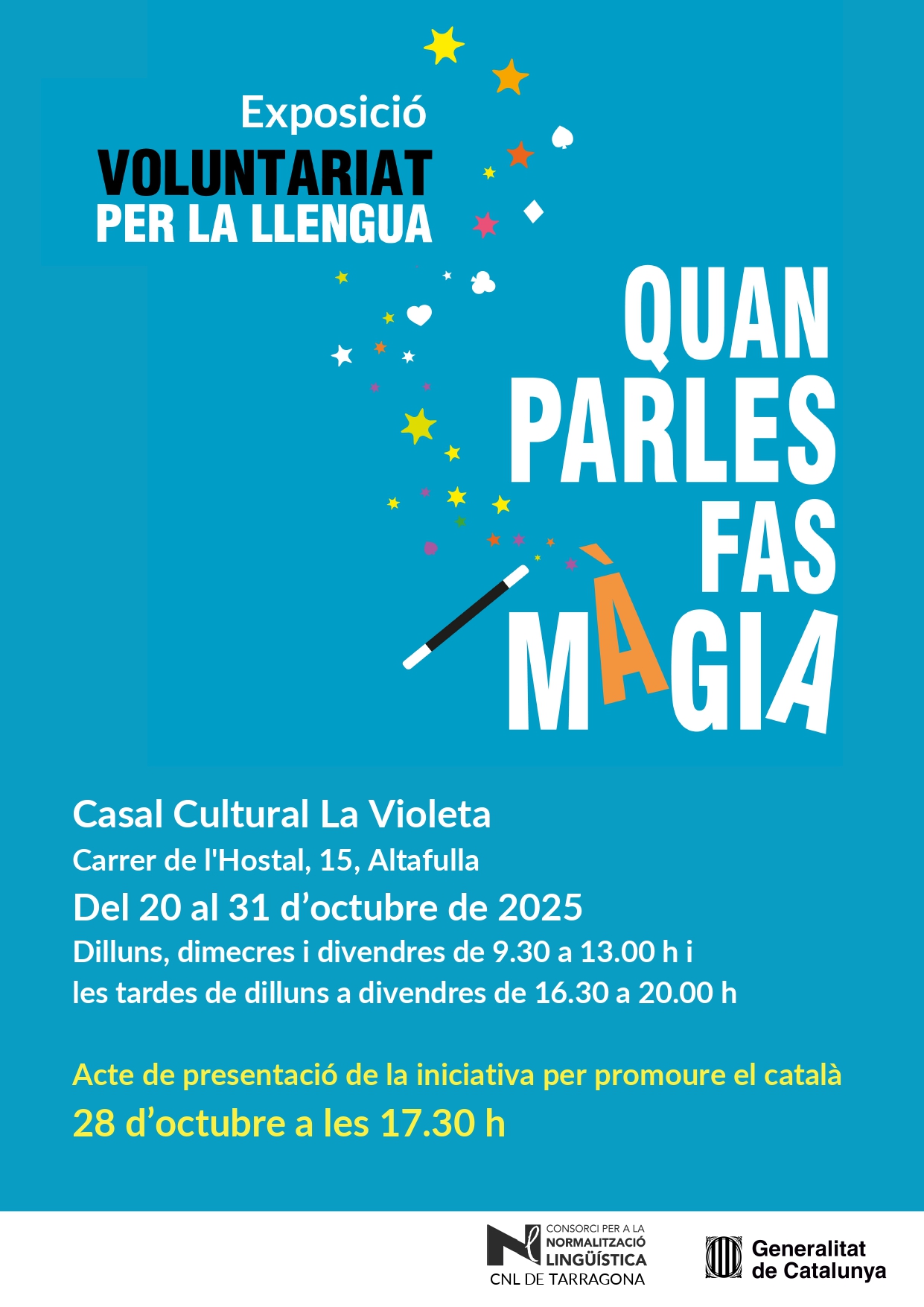 Del 20 al 31 d’octubre, el Casal municipal La Violeta d’Altafulla acull l’exposició “Voluntariat per la llengua: quan parles fas màgia”, una mostra que dona a conèixer aquesta iniciativa per promoure l’ús del català a través de converses entre voluntaris i aprenents.