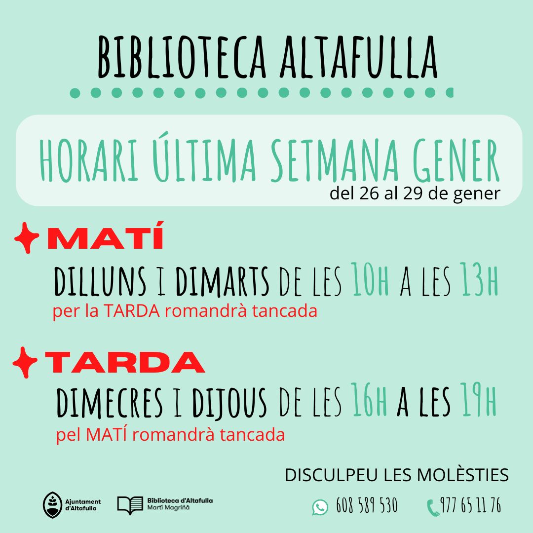 HORARI EXCEPCIONAL SETMANA DEL 26 AL 29 DE GENER: A LA BIBLIOTECA D'ALTAFULLA