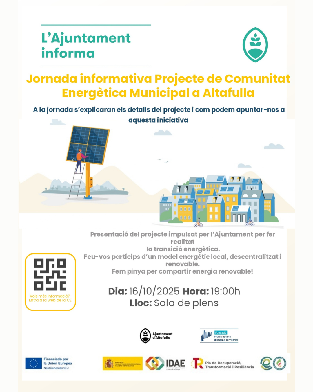 L’Ajuntament d’Altafulla organitza una jornada informativa sobre el Projecte de Comunitat Energètica Municipal, una iniciativa que vol implicar la ciutadania en la transició cap a un model energètic local, descentralitzat i renovable.