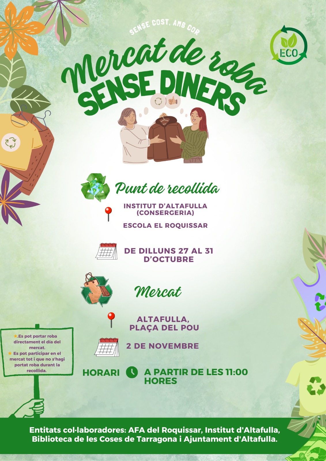Participa en una iniciativa sostenible i comunitària! Porta la roba que ja no utilitzes i emporta't peces noves sense intercanviar diners. És una opció de consum ecològica i de segona oportunitat.
