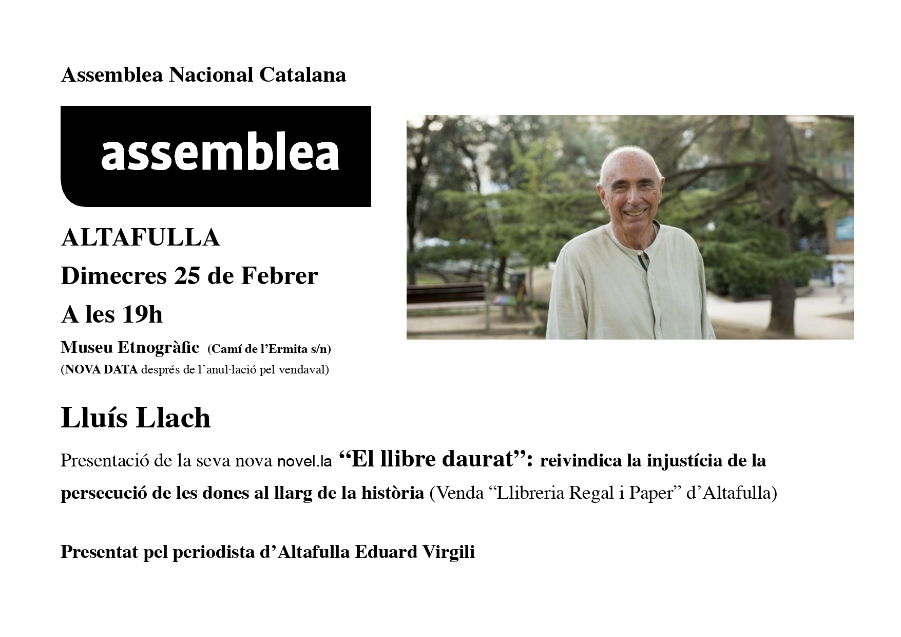 Altafulla acollirà el proper dimecres 25 de febrer, a les 19 h, un acte cultural destacat amb la presència de Lluís Llach, que presentarà la seva nova novel·la, El llibre daurat, al Museu Etnogràfic (Camí de l’Ermita, s/n).