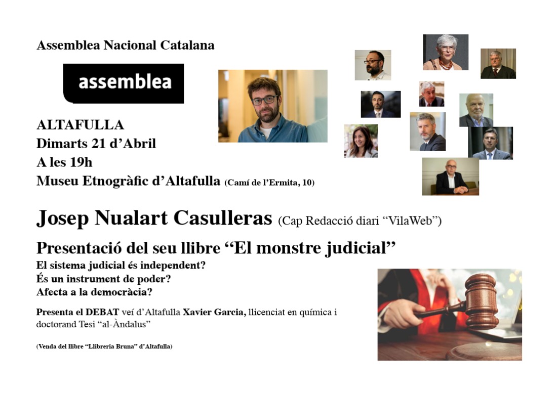 L'Assemblea Nacional Catalana d'Altafulla organitza una xerrada-debat al voltant de la justícia i el poder amb la presentació del llibre "El monstre judicial", escrit per Josep Nualart Casulleras, cap de redacció del diari VilaWeb.