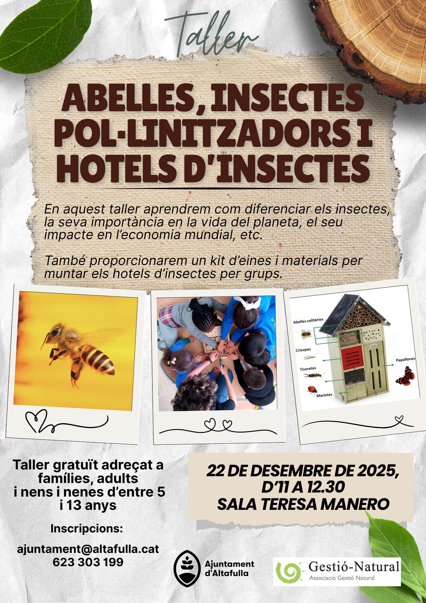 El taller també inclou una part pràctica on es proporcionarà un kit d’eines i materials per construir hotels d’insectes en grup, fomentant la cooperació i la sensibilització ambiental entre petits i grans.