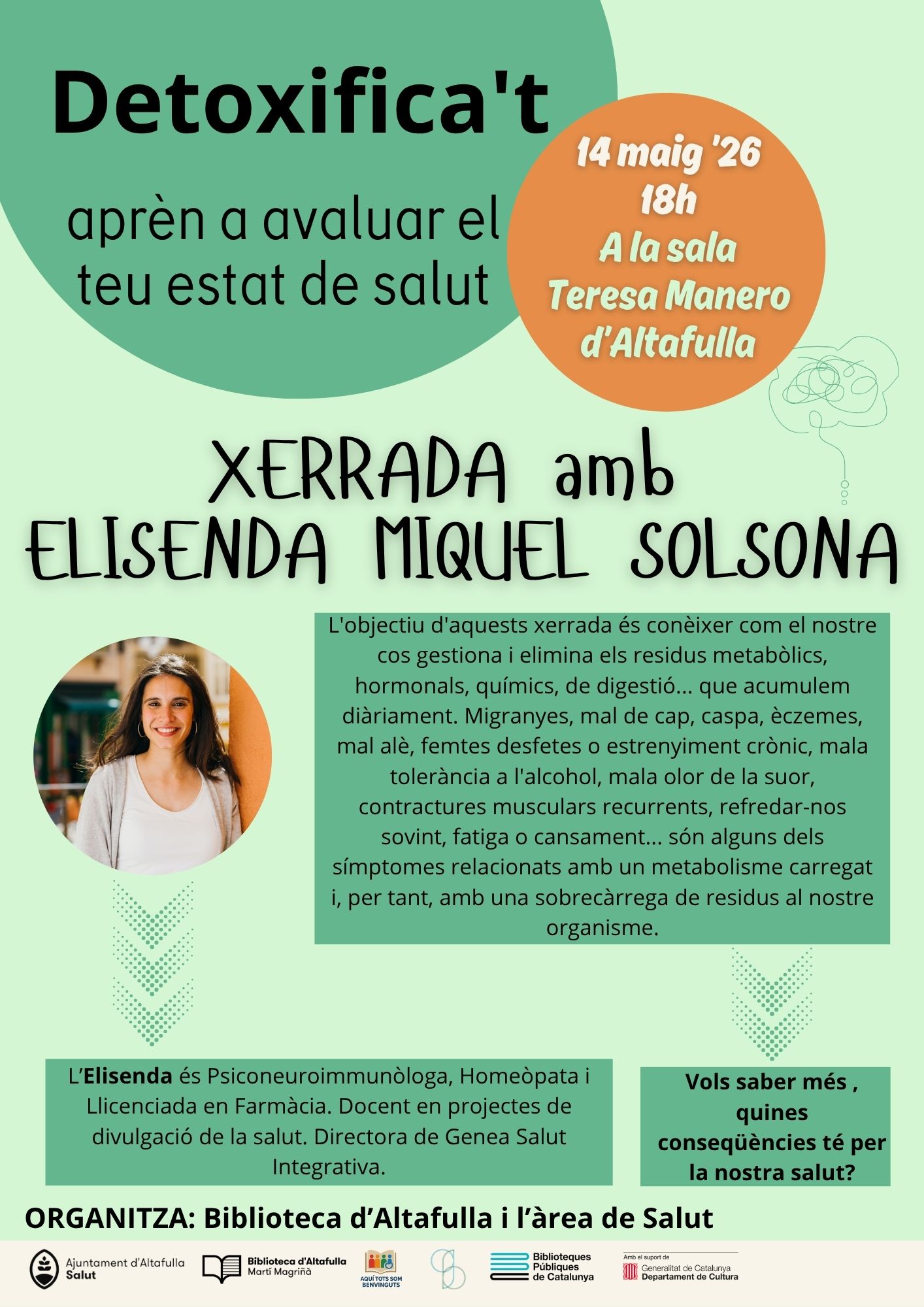 Et convidem a una trobada propera i reveladora amb Elisenda Miquel Solsona, una professional amb una àmplia trajectòria en salut integrativa, que t’ajudarà a comprendre com el teu organisme gestiona i elimina els residus metabòlics, hormonals i ambientals que acumulem dia rere dia.