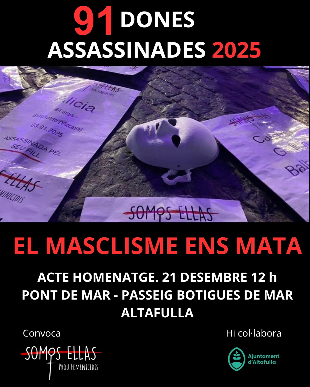 Sota el lema "El masclisme ens mata", l'entitat Somos Ellas organitza un acte d'homenatge a les 91 dones que han perdut la vida a causa de la violència masclista durant l'any 2025.