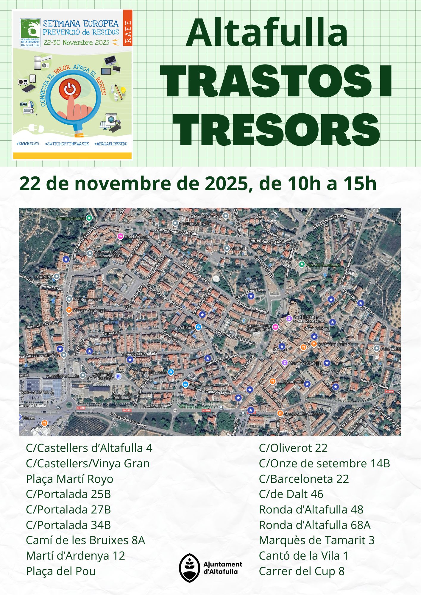 L’Ajuntament d’Altafulla se suma un any més a la Setmana Europea de Prevenció de Residus (22–30 de novembre) amb la iniciativa “Trastos i Tresors”, que tindrà lloc el 22 de novembre, de 10 h a 15 h, a diferents indrets del municipi.